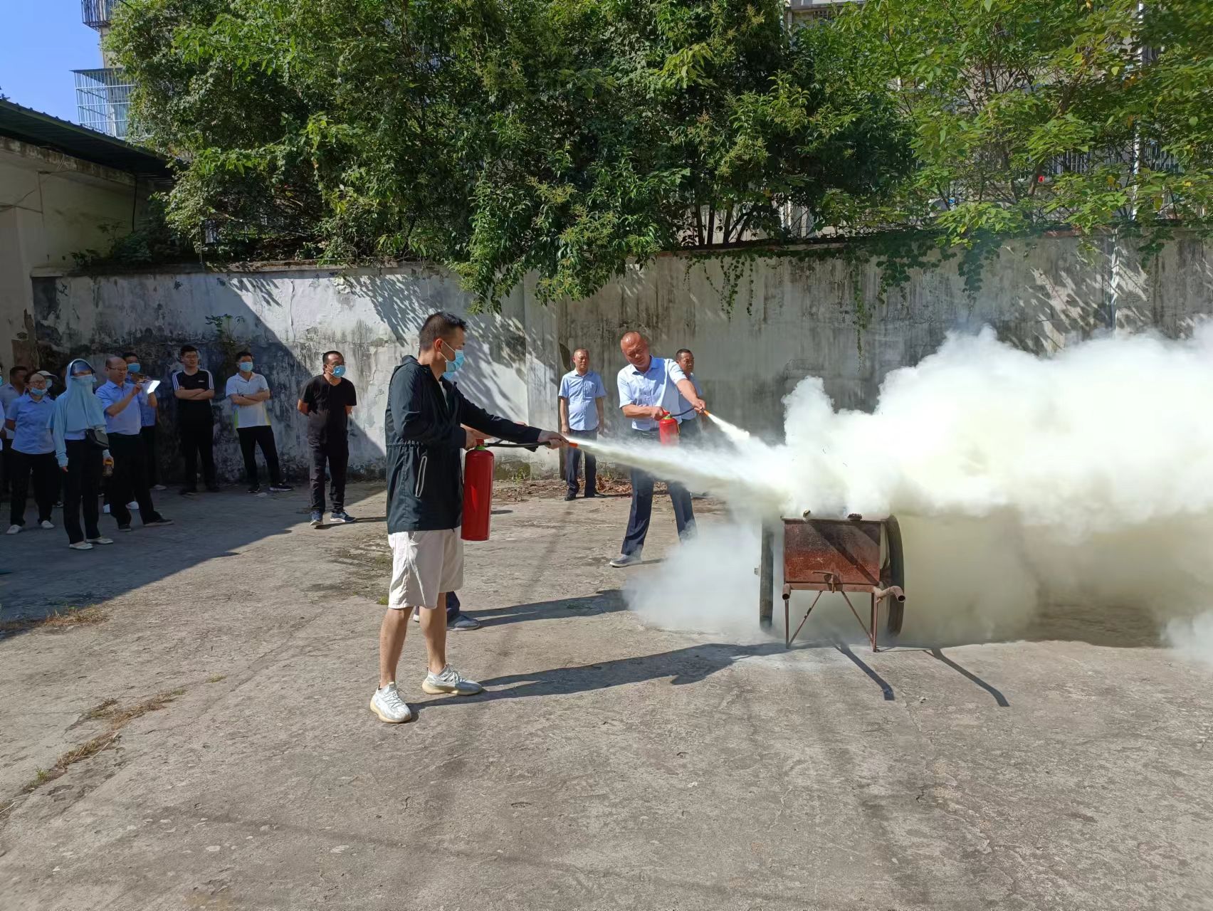 培訓現場,魏老師以PPT演示的方式,對火災防范、火災逃生等常識進行了詳細講解,并現場演示了滅火器、消防防毒面具、滅火毯等防火自救工具的正確使用方法。隨后,在魏老師的指導下,干部職工進行了消防滅火實操演練。